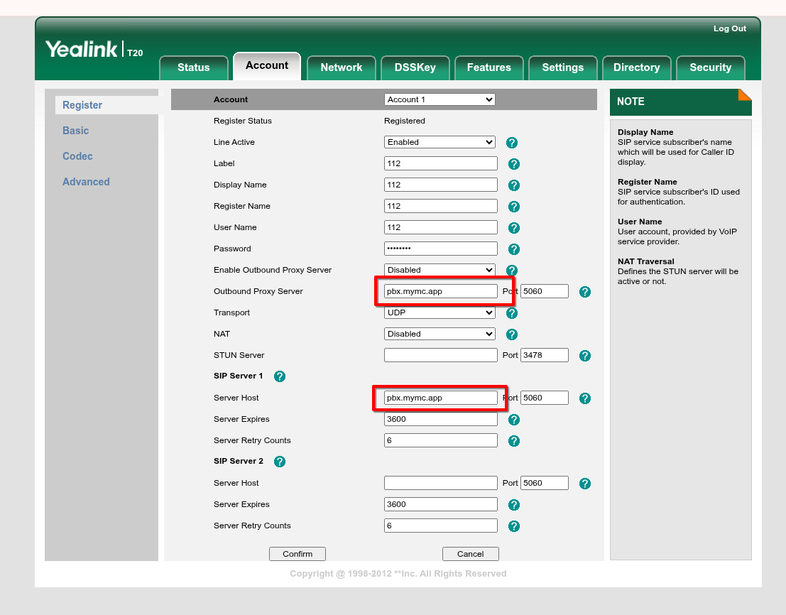 On the account tab, change the “Server Host” and “Outbound Proxy Server” to pbx.mymc.app. Then click “Confirm”.