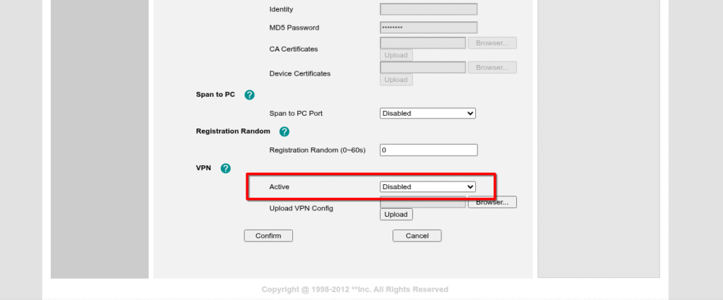 On the Network tab, under advanced, scroll down to vpn, set it to “Disabled”. Then click “Confirm”.