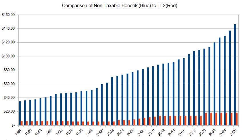 This 36 year chart is an after tax comparison of the two systems discussed in the book “Making Your Miles Count: Taxes, Taxes, Taxes”. The difference consistently becomes larger and larger, year over year because non-taxable benefits increase twice per year at a rate usually greater than inflation. The TL2 simplified method increases only randomly, for example: 2003 ($33.00 to $45.00), 2006 ($45.00 to $51.00), 2007 (start of the increase from 50%-80% deductible) and in 2020 the base increased again from $51.00 to $69.00. The after tax net benefit of $69.00 went to $18.40 (in the best province) up from $13.60.